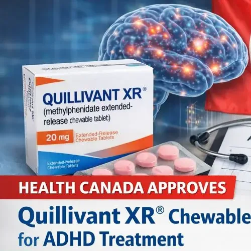 Health Canada has approved Quillivant XR (methylphenidate extended release) chewable formulation for the treatment of attention deficit hyperactivity disorder (ADHD) in pediatric and adult populations. This approval expands therapeutic options for patients who experience difficulty swallowing traditional solid oral dosage forms, addressing an important unmet clinical need.